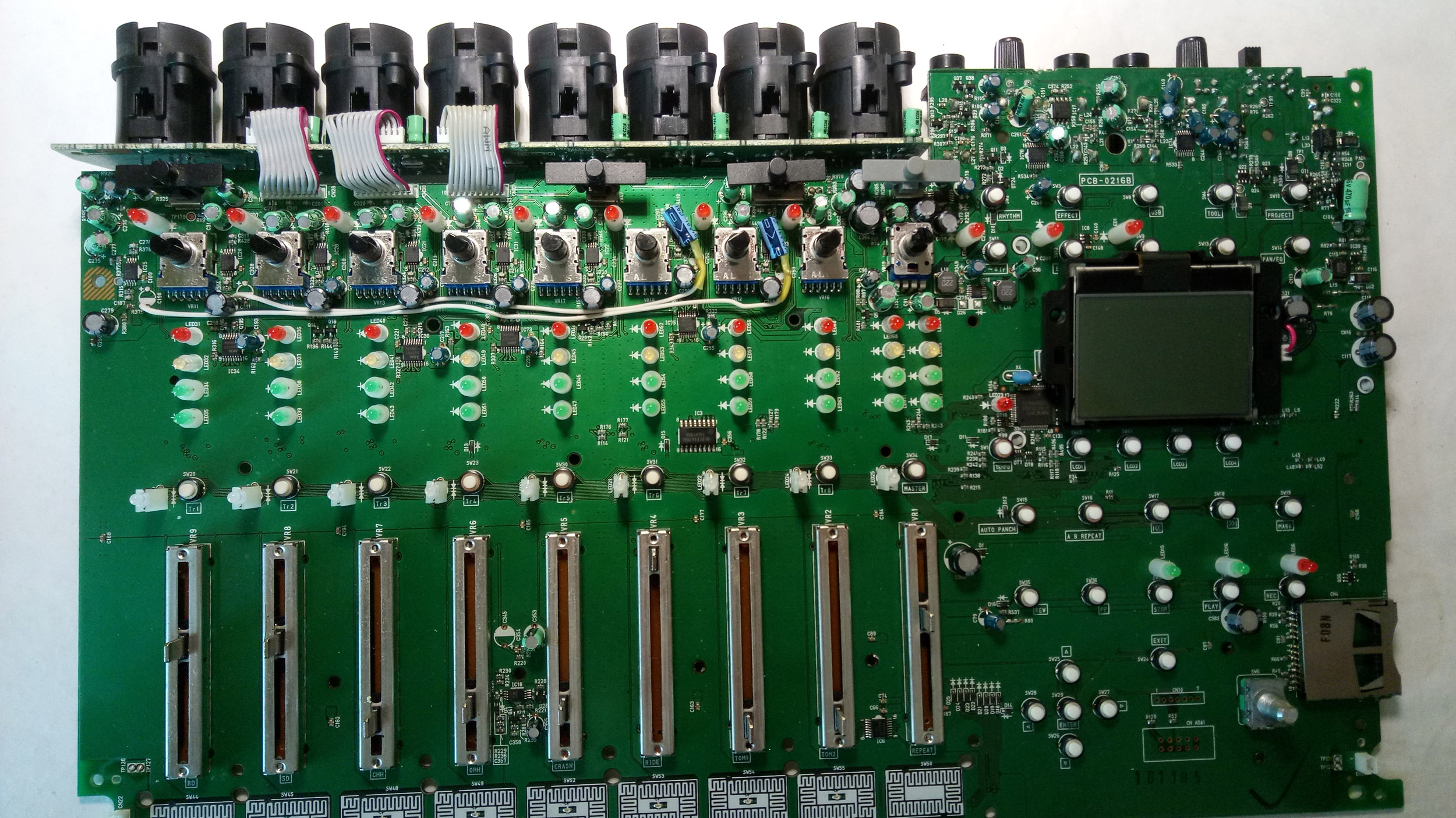 Приехали заказанные АЦП, три штуки на всякий. Не без танцев с бубном выпаял родной чип и запаял новый. Реакции ноль, как не проходил сигнал, так и не проходит. Осциллограф на цифровых ногах управления показывает абсолютно идентичную картину с соседним АЦП с 5, 6 каналов, т.е. управление АЦП идет и с цифрового выхода аудиоданных идет изменяющаяся частота, т.е. свою функцию чип выполняет, судя по всему. Попытался отследить по дорожкам, кто управляет этими АЦП- вышел на камень на красной плате "мозгов". При касании корпуса чипа и включенном режиме записи 7 и 8 дорожки возникает сильный фон и треск на обоих каналах (проверил на других- такой картины нет, все тихо), т.е. впечатление такое, что цифровой аудио канал АЦП 7,8 входов на данном камне вышел из строя. Огорчительно(. Купить отдельно плату мозгов практически нереально, камень с пайкой в инфракрасной печке (у меня такой нет, поэтому сам поменять, даже если найду новый, врят ли смогу). Собрал пока. На будущее решил так, если таки мало будет 4 фантомных входов, то переведу 7 и 8 входы, на 1 и2, которые не имеют фантома (штатные микрофоны хоть и маленькие 6мм, но иногда может возникнутьв них необходимость что-то быстро записать без подключения внешнего микрофона, поэтому хочется иметь их в доступе на всякий). Сделать это несложно, на выходе операционников стоят электролиты, с которых сигнал идет уже на АЦП. Вот с ноги электролита и можно перекинуть каналы, чтобы не мучиться с перенаправлением шины АЦП.