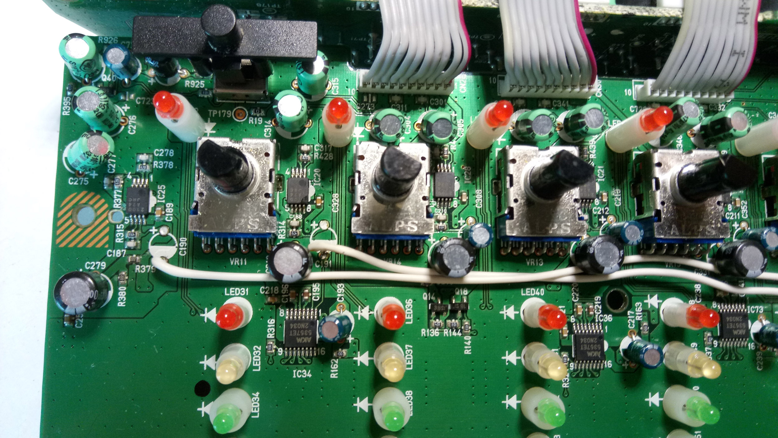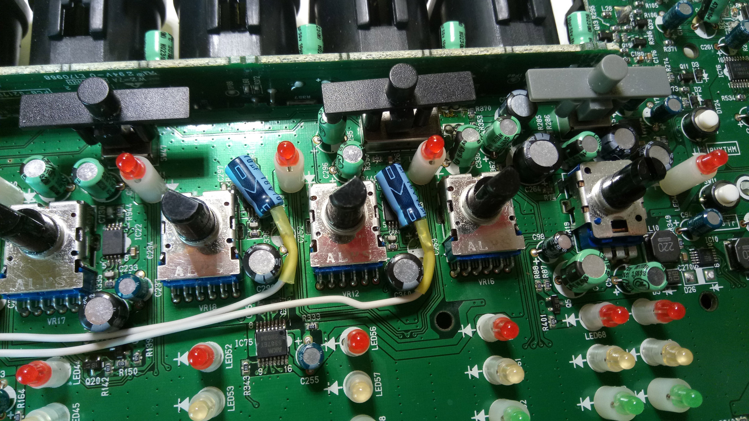В длительные новогодние выходные руки дошли до очередной разборки R24 и перевода 7,8 входа на 1.2. Заодно вернул на место родной чип АЦП. Выкинул электролитические конденсаторы с выходов операционников 1,2 и 7,8 входов (10мкфх16В). На место выпаянных 7,8 впаял новые Рубиконы такой же емкости, а выход с их ножек бросил на вход АЦП 1,2 канала. На фото все хорошо видно. Теперь 6 каналов с фантомом и возможность писать со встроенных 6мм капсюлей. Кстати, их экранирование вообще никакое, не спасает даже внутренний экран на задней крышке рекордера. Вроде и распайка выполнена экранированными тонкими проводами, а вот от самих капсюлей до разъемов на плате идут тонюсенькие проводочки, вот они и ловят помехи, приходится кидать землю на корпус. Есть еще один момент, который видимо будет в дальнейшем ликвидироваться. Подключал разные конденсаторные микрофоны, с некоторыми в аудиосигнал идет писк от повышающего импульсного преобразователя фантома +48В. Видимо на его выходе недостаточная емкость электролита. Будем поискать.