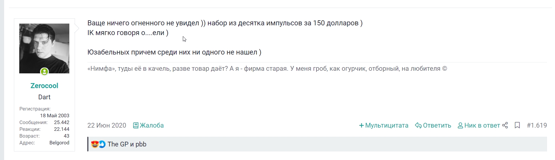 @MoVoX, Отчасти соглашусь. Он работает чисто в режиме "прилепил и хорошо", "прилепил образ кабинета". РулИться он не способен как любой импульсник, он способен переключаться в патчах бодро, и на этом всё, собсно это удел любого импульсника, редактура импульса звучит в основном просто ужасающи. Это хорошо для киноиндустрии, опять же, выбрал нужную сцену, и погнали. А музыканты, он те ещё извращенцы, они любят каждый регулятор в оригинальное положение поставить, на 13.5 часов!