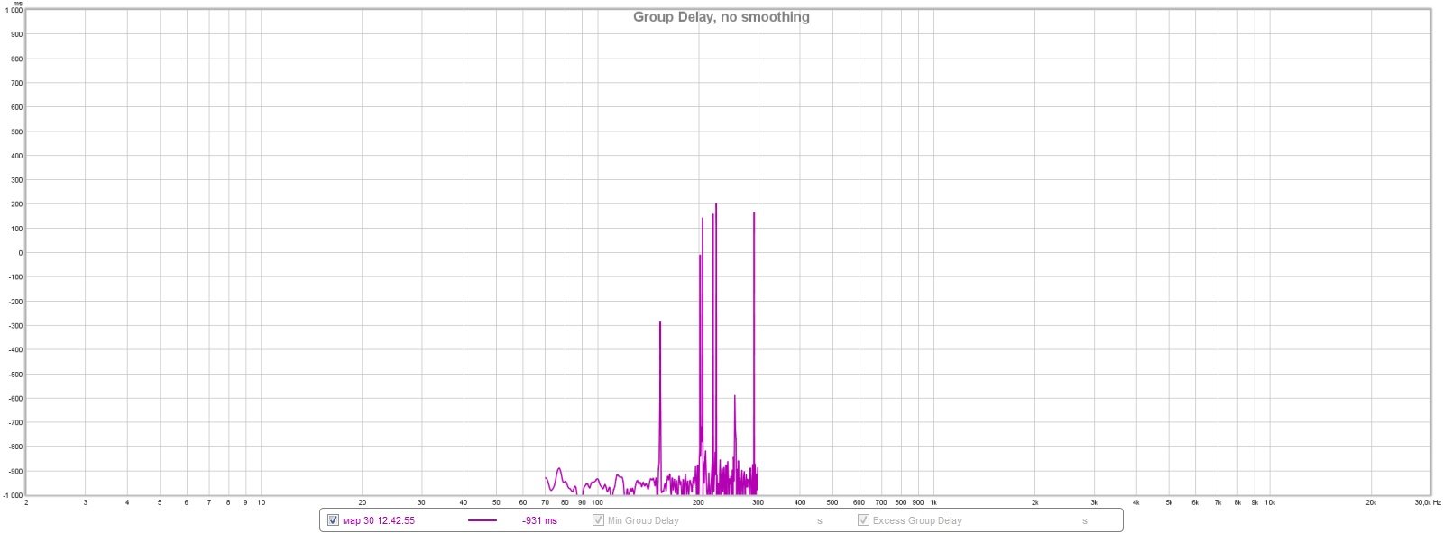 в group delay меняется время появления сигнала. Но как-то странно. первый замер показывает -931 мс(как это вообще минус, ну да ладно), второй -832 мс. третий почему-то вообще резко +623 мс. Или не то смотрю....