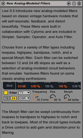 New analog-modeled filters based on classic vintage hardware models capable of self resonating, feedback and distortion are added to Simpler/Sampler, Auto Filter and Operator.