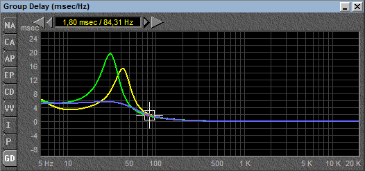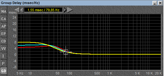 Групповое время задержки (ГВЗ), с определенного момента, остается постоянным на низких частотах. Если по научному, то ГВЗ - это производная фазо-частотной характеристике по частоте. Т.е. - степень изменения ФЧХ.