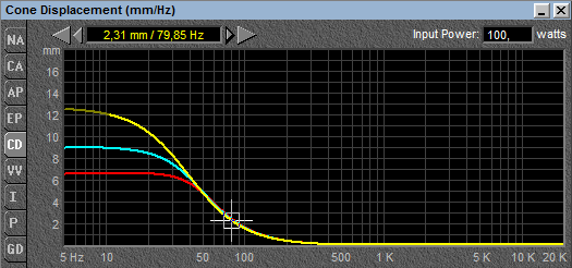 Вот график линейного хода в зависимости от частоты на том же 12 дюймовом динамике в тех же литражах (50 - 80 - 150). Подводимая мощность - 100Вт