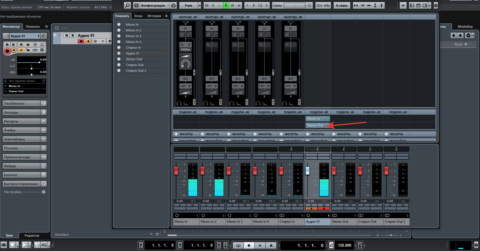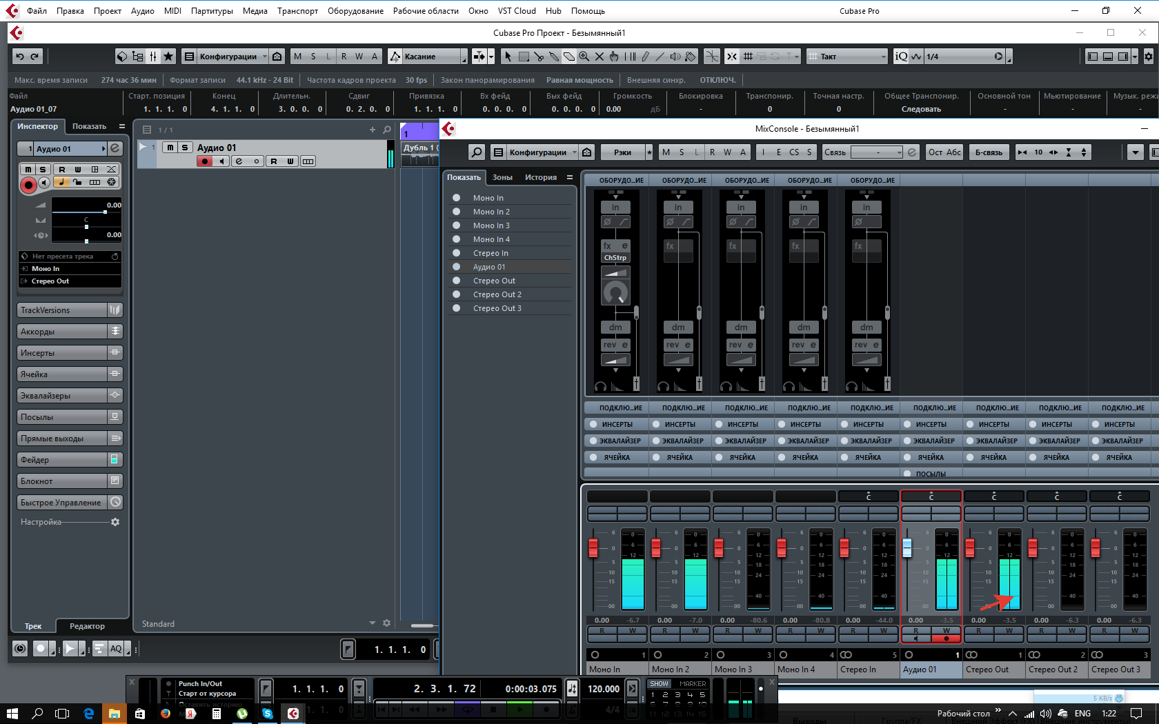 1 Настройки входов и выходов. 3. Включен прямой мониторинг. 4. Включена желтая кнопка на мониторинге во время записи. Не понятно, почему и откуда идет сигнал и на второй вход? 5. Сигнал со входа, посылается на самую первую шину на выход, мастер шину. 6. Прослушивание, отключение желтой кнопки. Индикация на входах, возможно сигнал попадает в микрофон. Экспорт вместе с обработкой на входе.