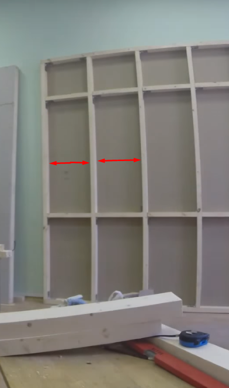 Если судить по ширине ГКЛ, ширине плит минваты и ширине бруса, то у вас там получился шаг 550 между стойками, если я ничего не путаю.
