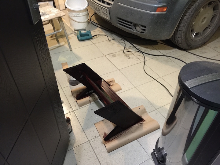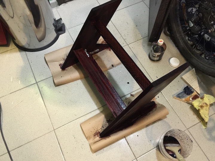 Делаем отверстия под шурупы. Узкое сквозное и широкое углубление. Лакируем под красное дерево :-)