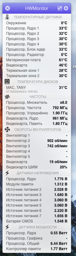 Далее - GPU, что пэндовс, что OSX показали одинаковые результаты 43+/-1 градуса цельсия (в режиме бездействия). Вопросов нет. Но, вот питание, котрое 12V почему-то потребляет 13.141-13.192V в OSX и в винде этоже значение = 8.345V. Подозреваю, что именно из-за этого CPU в OSX греется сильнее чем в WIN7. Мониторил HWsensor.app и TemperatureGauge.app