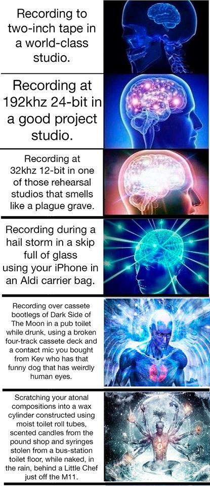 1) записываешься на 2-дюймовую плёнку в студии высшего уровня 2) записываешься в 192/24 на хорошей проджект студии 3) пишешься в 32/12 в одной из тех репбаз которая воняет чумной могилой 4) пишешься во время бушующей бури с градом в баркасе груженым стеклом на айфон накрышвись полиэтиленовым пакетом 5) пишешься поверх на компакткассету бутлегов тёмной стороны луны в сортире паба, бухой в жопу, используя сломанную 4-х дорожечную портастудию и контактный микрофон который ты купил у Кевина у которого смешная собака с невероятно человеческими глазами 6) запиливаешь свои атональные треканы на восковый валик который собрал при помощи влажных трубок от туалетной бумаги, пропитанных свечками из супермаркета и шприцами, украденными из туалета на автобусной остановке, голый, под дождём, во дворе кафешки Little Chef, прямо у съезда трассы M1 - если кто английского не знает, примерно так