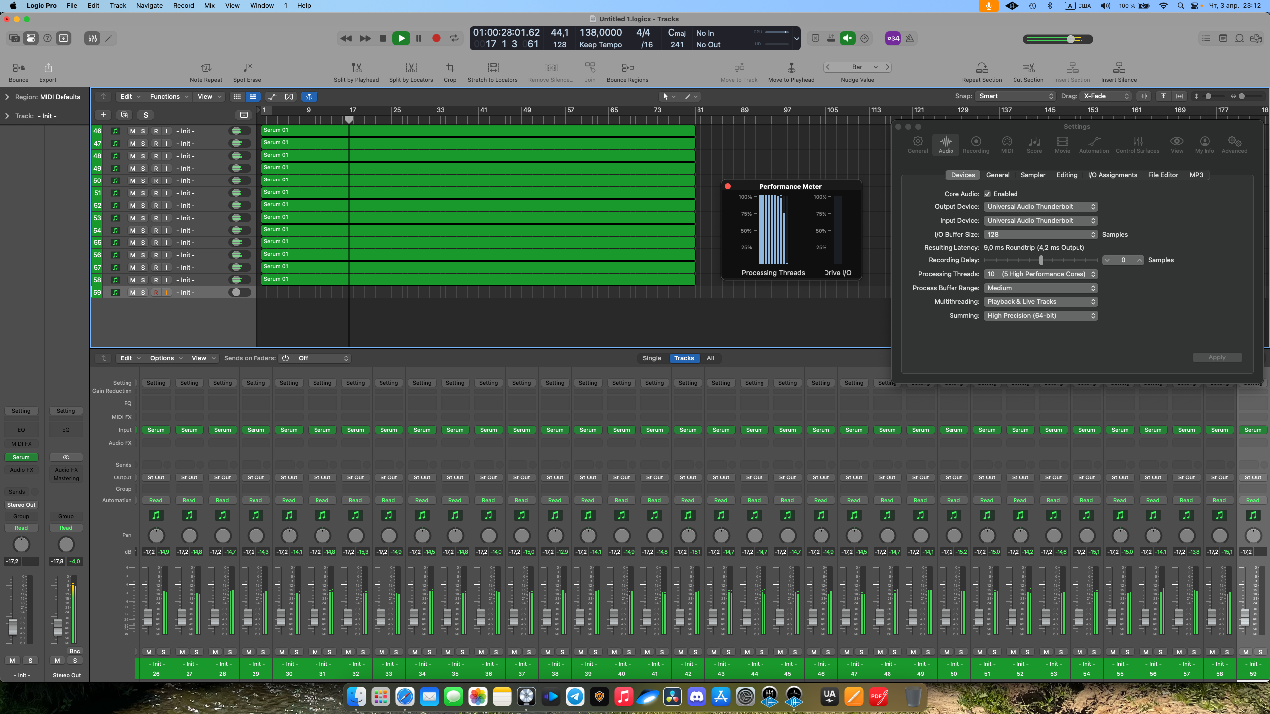 А что за интерфейс? Что-то маловато. У меня (Babyface Pro FS) на буфере 48smpls 44,1KHz, (ASIO Guard - 30мс, как у Куба поставил) получается 52 трека с первым Серумом.