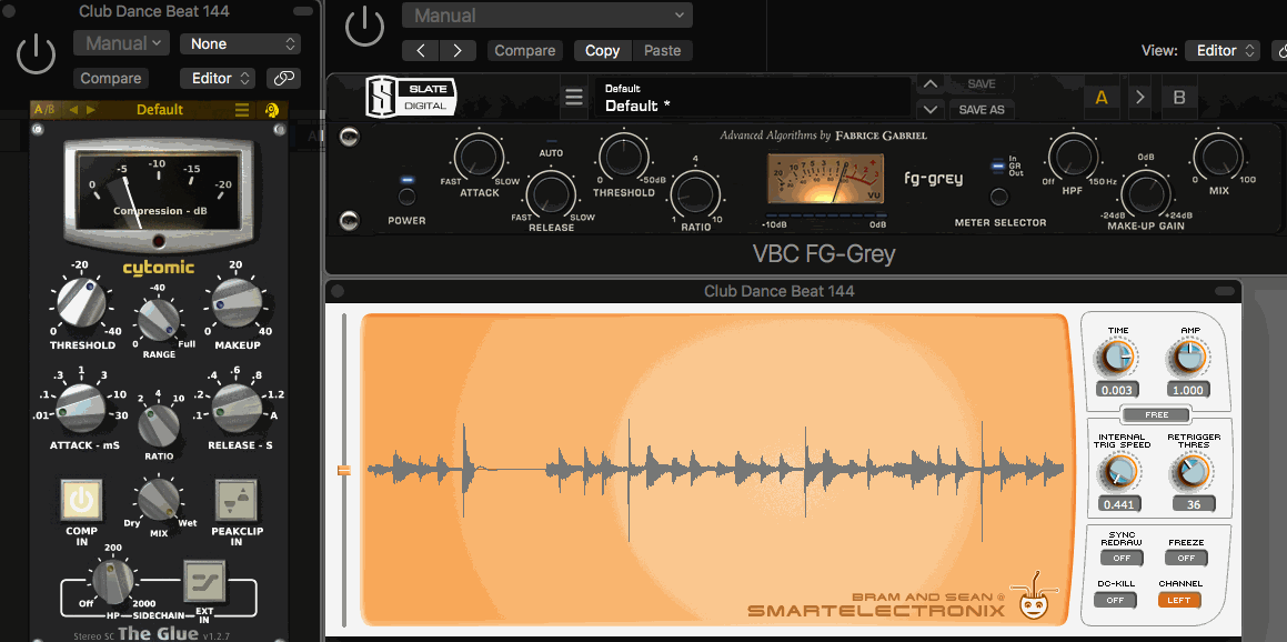 Потестировал еще Grey. Все таки мне нравится больше как он работает по сравнению с Glue, не глядя на графики, а на слух. Еще потестил на самых быстрых настройках релиза и атаки, glue пропускает пики, и звучит это не очень. Слейт нормально отрабатывает, пример на гифке и характерный луп с острыми пиками, над которым все эти действия производились