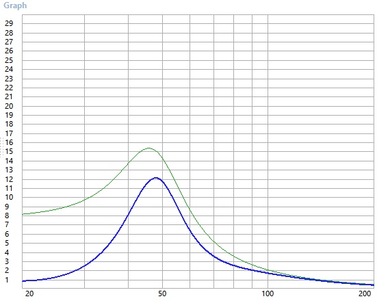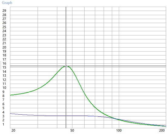 Оптимальный ФИ выходит ящик ~12 литров, с настройкой на 48гц и граничной по -3дБ частотой 44Гц