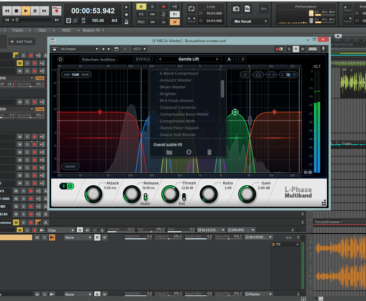 По поводу LP MB - обновили достойно. В первой версии пресетов вообще небыло, насколько помню, сейчас довольно много. Появилась кнопка Sidechain Audition. Ресурсы кушает, но не так что б вешать Сонар - все работает стабильно. На картинке видно как загружены 12 ядер. Задержку он вносит неслабую, поэтому применять лучше в самом конце, на этапе мастеринга.