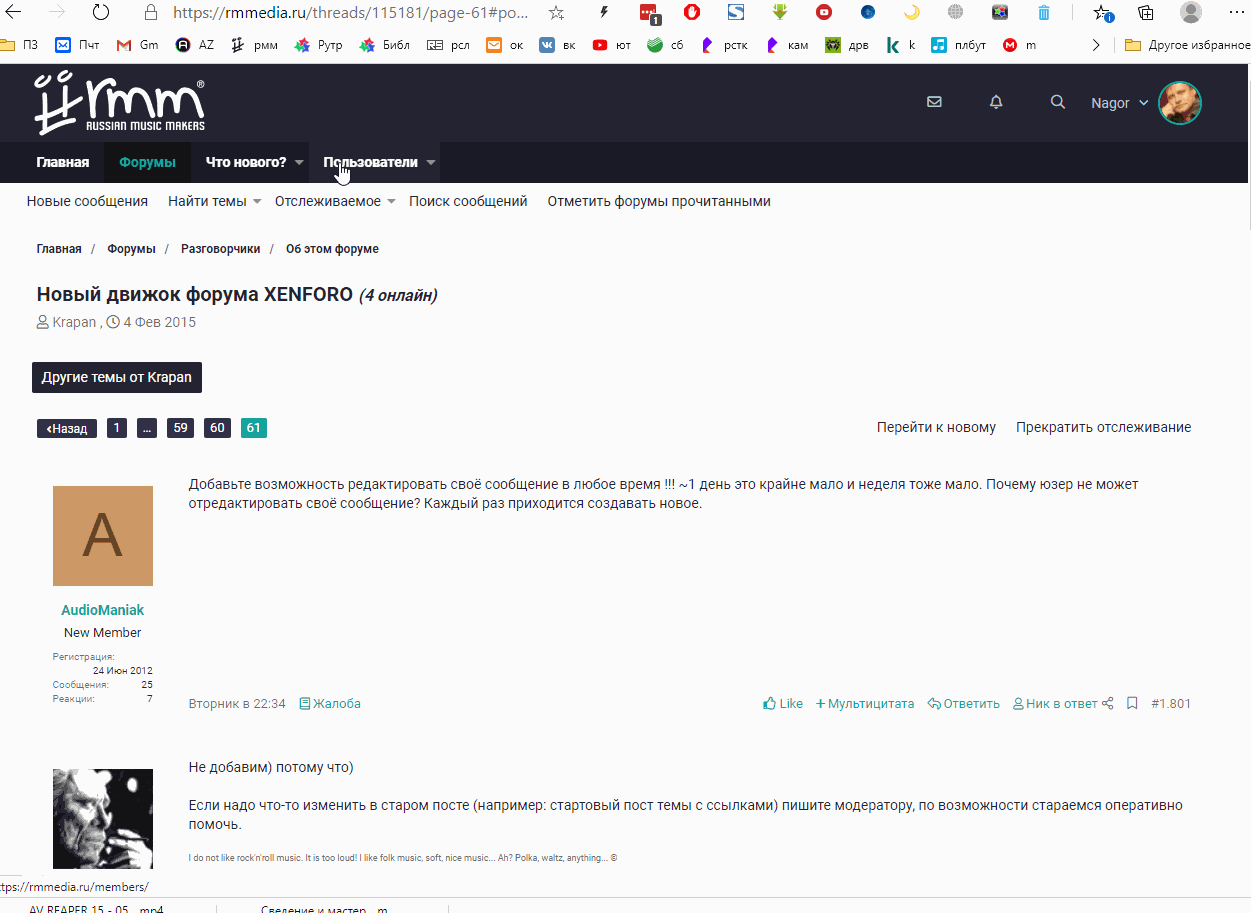 Добавьте возможность редактировать своё сообщение в любое время !!! ~1 день это крайне мало и неделя тоже мало. Почему юзер не может отредактировать своё сообщение? Каждый раз приходится создавать новое.