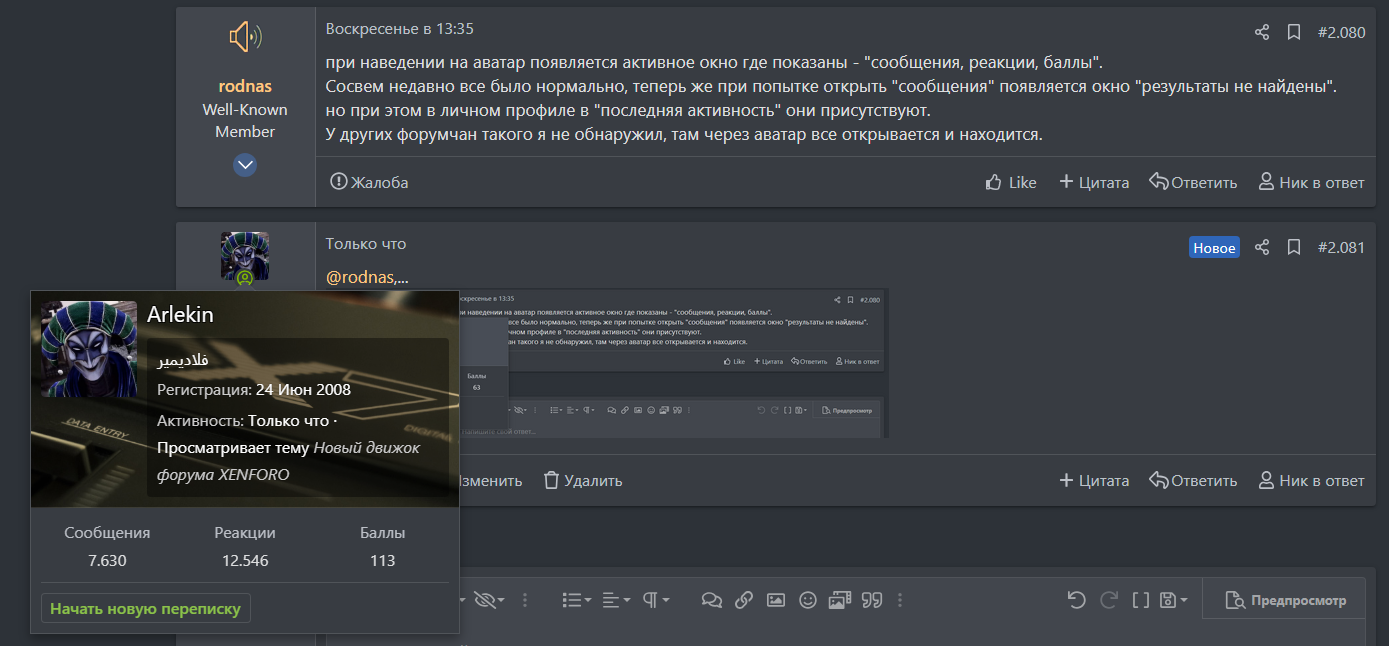 при наведении на аватар появляется активное окно где показаны - "сообщения, реакции, баллы".