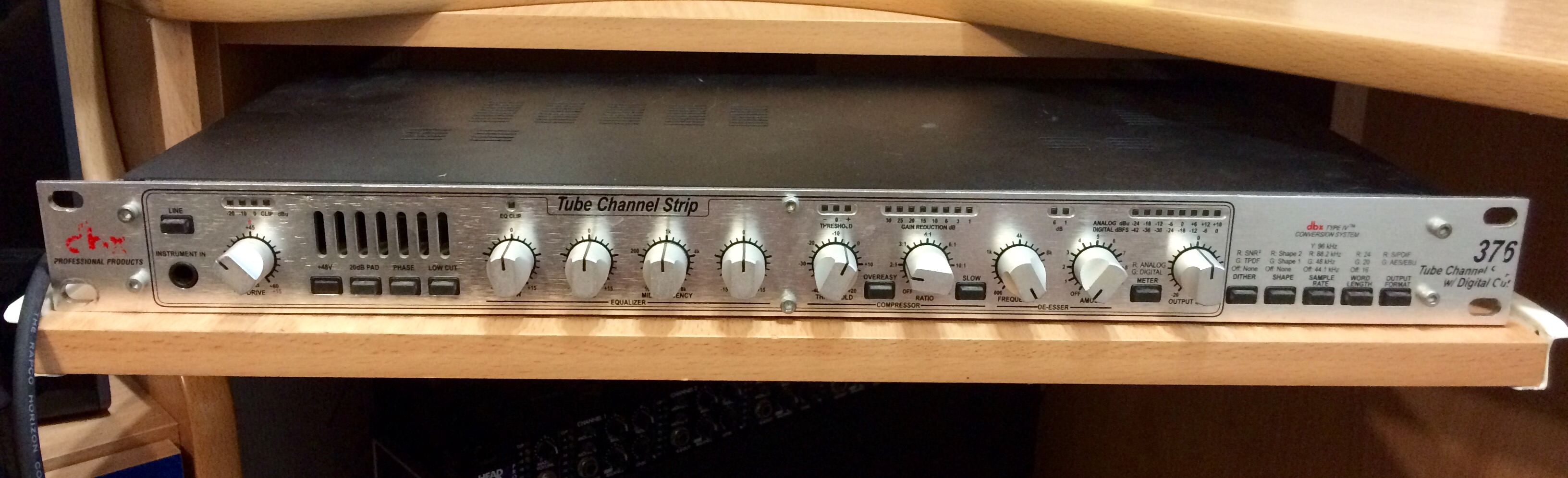 Ламповый микрофонный процессор с цифровым выходом dbx 376 - одноканальный комплексный прибор с цифровым выходом формата 24 бит/ до 96 кГц, состоящий из секции лампового микрофонного предусилителя, 3-полосного эквалайзера, компрессора и де-эссера.
