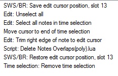 MIDIEditor_LastFocused_OnCommand(NamedCommandLookup("_RS7d3c_0e9ffdc242cf1ec9080bf27ec6722c0f926cecfb"), 0); // ME action: "Script: Delete Notes Overlaps(poly)"