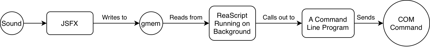3. When the ReaScript receives a message from the JSFX, send the COM command. This may be done from Lua in several ways, but possibly the most straightforward is by calling a program on the command line (see ‘reaper.ExecProcess()’).