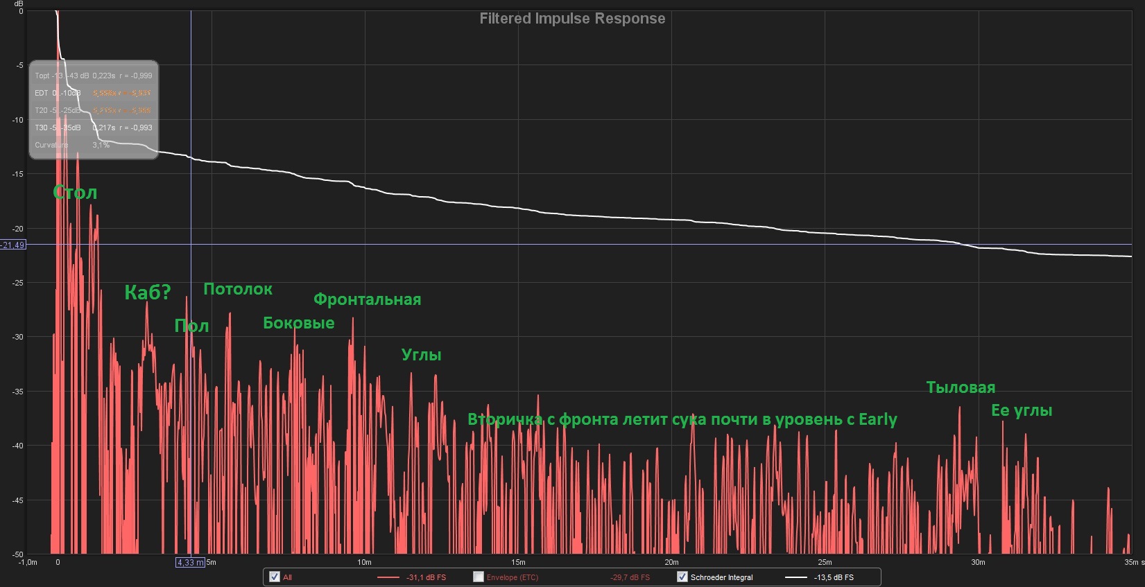 Ранние в -25 дБ. Хорошо, но, кажется, можно было бы и лучше:) АЧХ комнаты(без стула) походу в пределах +/6 дБ, хорошо конечно, но хочется лучше, тем более что я по сути ничего пока еше не делал, просто расставил все as is. Даже без огромных пушистых зеленых ковров.