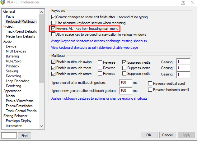 Да риперу то как раз известно с чем работать, так как там уже что то выбрано трек, айтем и т.д. вот только кнопка alt в windows перекидывает фокус на верхнее меню, то которое
