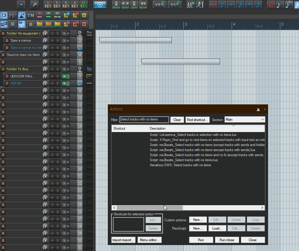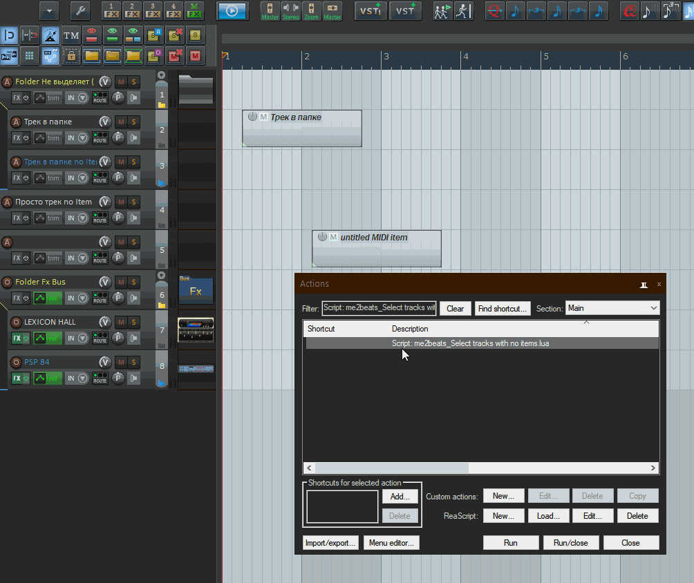 Мне не для удаления надо! Я сделал себе цикл - спрятать все треки без айтемов и кнопка у меня загорается сигнализируя о спрятанности.)) При нажатии на эту же кнопку, треки восстанавливаются и кнопка гаснет! Просто скрипт Xenakios/SWS: Select tracks with no items работает с большим количеством треков очень медленно, по сравнению с me2beats_Select tracks with no items.lua.