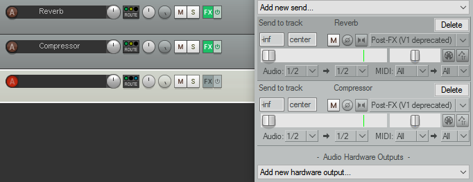 Мне кажется, на скрине отображён посыл с выделенного трека на треки с эффектами, то есть обратное тому, что вы описали. Причём, в одном скрине две картинки из противоположных ситуаций.