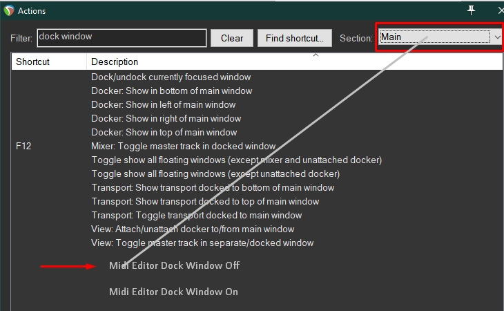 Мне надо развязать скрипт для Midi Editor-а Options: Toggle window docking ID - 40018, Посмотреть вложение 200206 Посмотреть вложение 200207 на два отдельных, которые бы либо включали, либо выключали это состояние (ON и OFF). Можно и ещё один,, который мог менять статус типа если включен, то выключить... и главное, чтобы эти скрипты загружались в окно actions Main и работали из окна аранжировкиПосмотреть вложение 200208