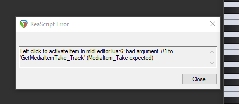 Ребята. Есть такой у меня скрипт. Его функция активация айтема внутри миди редактора по лкм. Тоесть выбираю я соседний и он активируется как в аранже, так и в мидиредакторе. Но есть один незначительный момент, который не очень нравится. Когда нет созданного айтема на дорожке выскакивает предупреждение об его отсутствии (добавил скрин). Собственно вопрос: можно как то это исправить чтобы ошибка не выскакивала? может добавить в код что то? люди знающие подскажите пожалуйста.