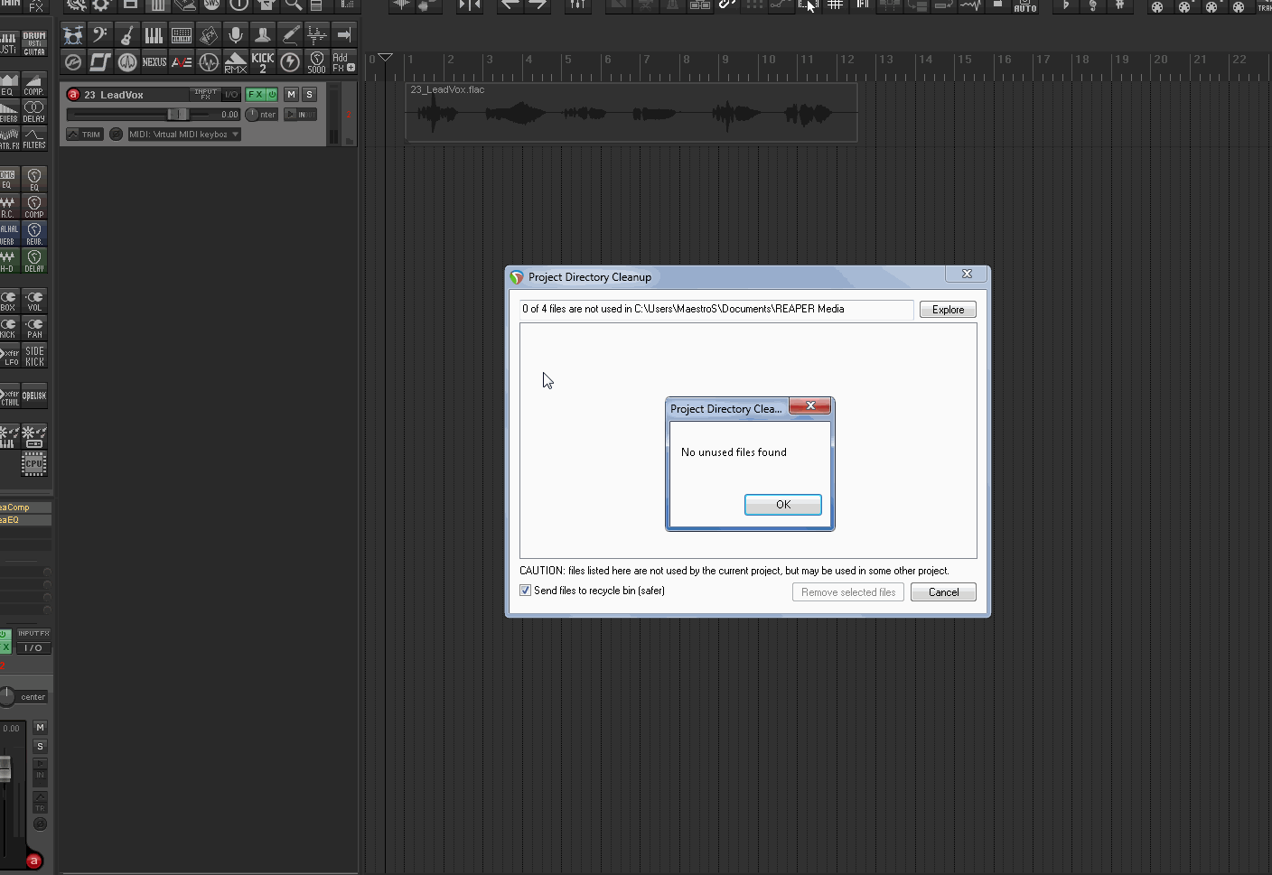 Мы по-моему говорим о разных вещах. Когда мы делаем Unfreez мы удаляем все файлы с трека и возвращаем его в нормальное состояние с его оригинальными файлами. Мы больше не используем файлы которые удалил Unfreez они так и весят Project Directory Cleanup до удаления вручную. А при повторном фризе создаются новые которые также уходят в небытие при следующей разморозке и так по кругу не затрагивая оригинальные файлы. Так зачем же их держать десятками на винте если можно их сразу удалять. Просто нужно чтобы Unfreez срабатывал циклически только на фризенных треках, так как они не содержат оригинальные файлы, а лишь их обработанные копии. Если трек заморожен (его оригинальные файлы находятся на месте и не тронуты, и лишь Reaper знает, что они задействованы в проекте но на данный момент не используются, а за них играют фризенные копии ) значит включается стирание фризенного (обработаные копии вот их то и нужно удалять) и запускается Unfreez который возвращает оригинальные файлы на место.Как вы думаете, как скрипт его будет искать?