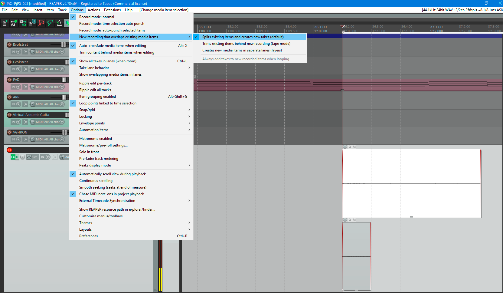Cпасибо, за ответ нашел я этот экшн называеться он Implode items on same tack into takes теперь айтемы преобразовываются в тейки но при новой записи на этот же трек Reaper снова создает айтемы вместо тейков подскажите как это настроить?
