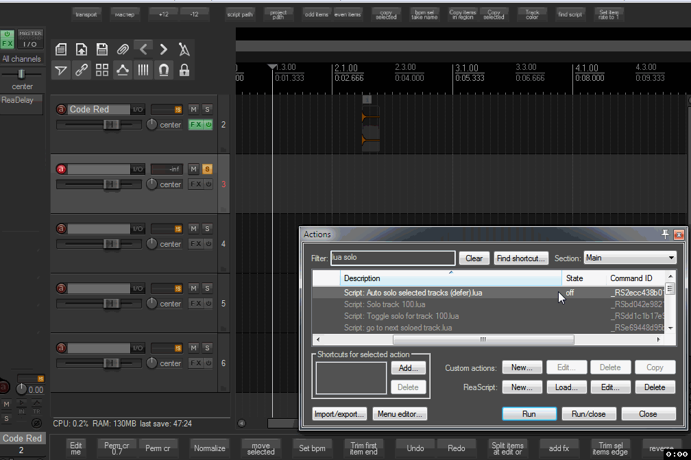Только теперь проблема в том, что при работающем скрипте невозможно выключить соло, только приходится прерывать работу скрипта (ведь автосоло мне нужно по большей части для одной задачи - отбора дублей). Получается, что "штатной" опции для такого поведения соло в самом Рипере нет.