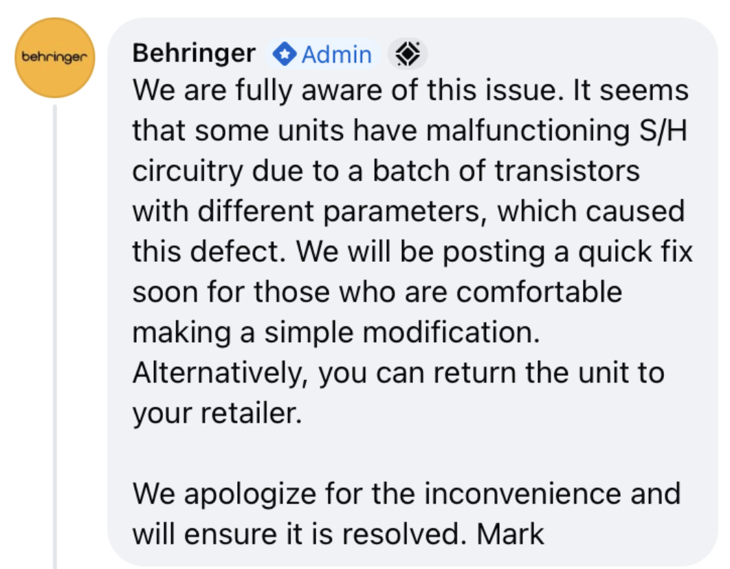Behringer признал проблему с S/H на Model 15.