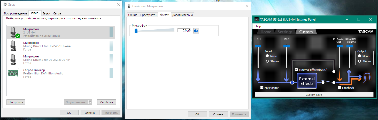 Итак, после правильной чистой установки драйверов и подключения карты после этого, Устройством по умолчанию является US 4x4, уровень его как и прежде стоит на 0db и подвигать его невозможно.