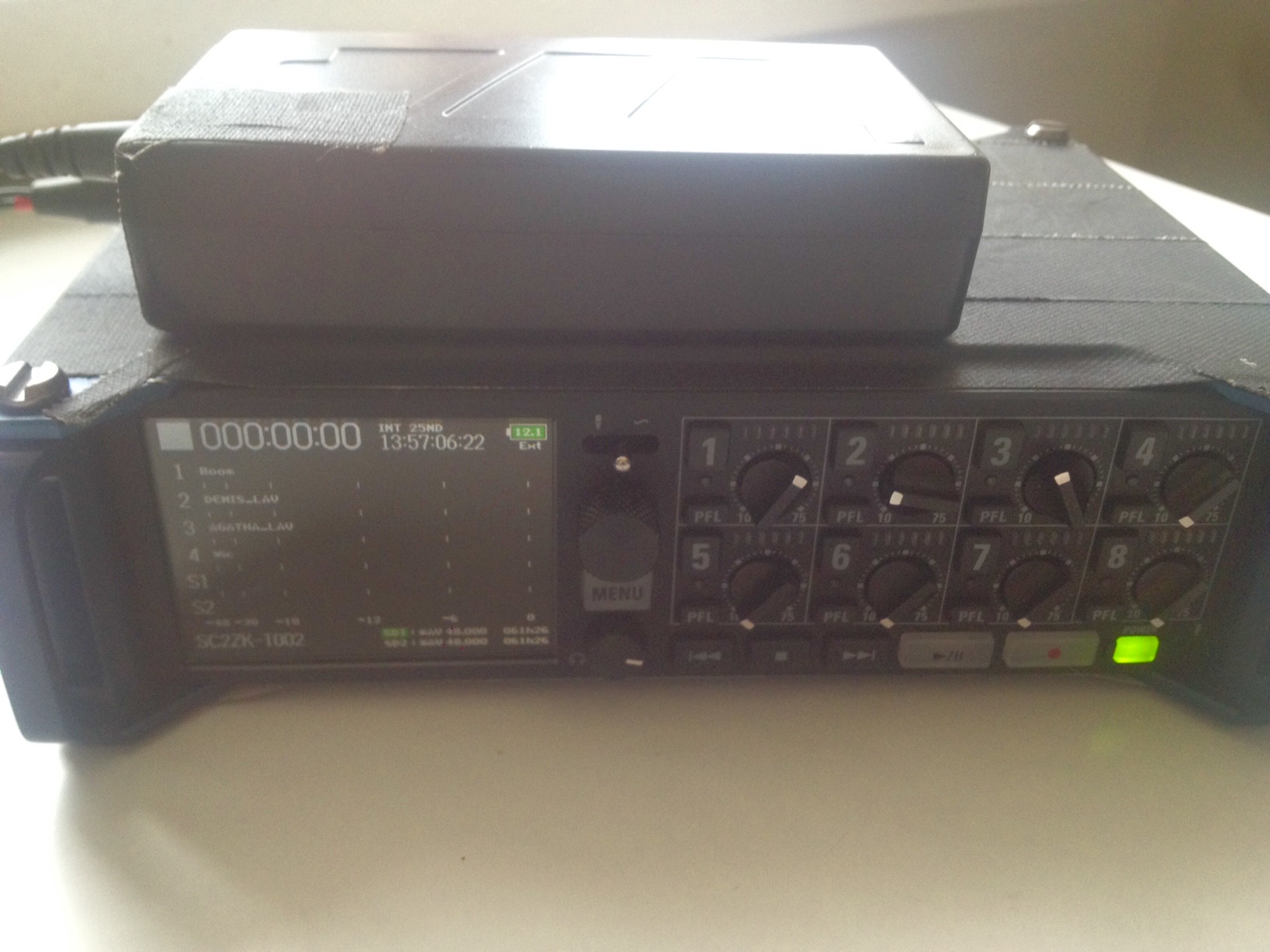 таймкод может уплывать, если девайс выключать надолго (тот же 633й Sound Devices держит таймкод два часа, после выключения) - этому три решения, реджэмить после вкл/выкл с камерами, навесить таймкод генератор tentacle sync например, либо не выключать рекордер весь съёмочный день, я так и решил вопрос, благо рекордер легко запитался от уже имевшихся DC-12 LiPo (спаял кабель DC-Hirose) - аккумулятор с ёмкостью 6800 mAh держит 10-12 часов с фантомным питанием 1-2 каналов и записью всех восьми каналов
