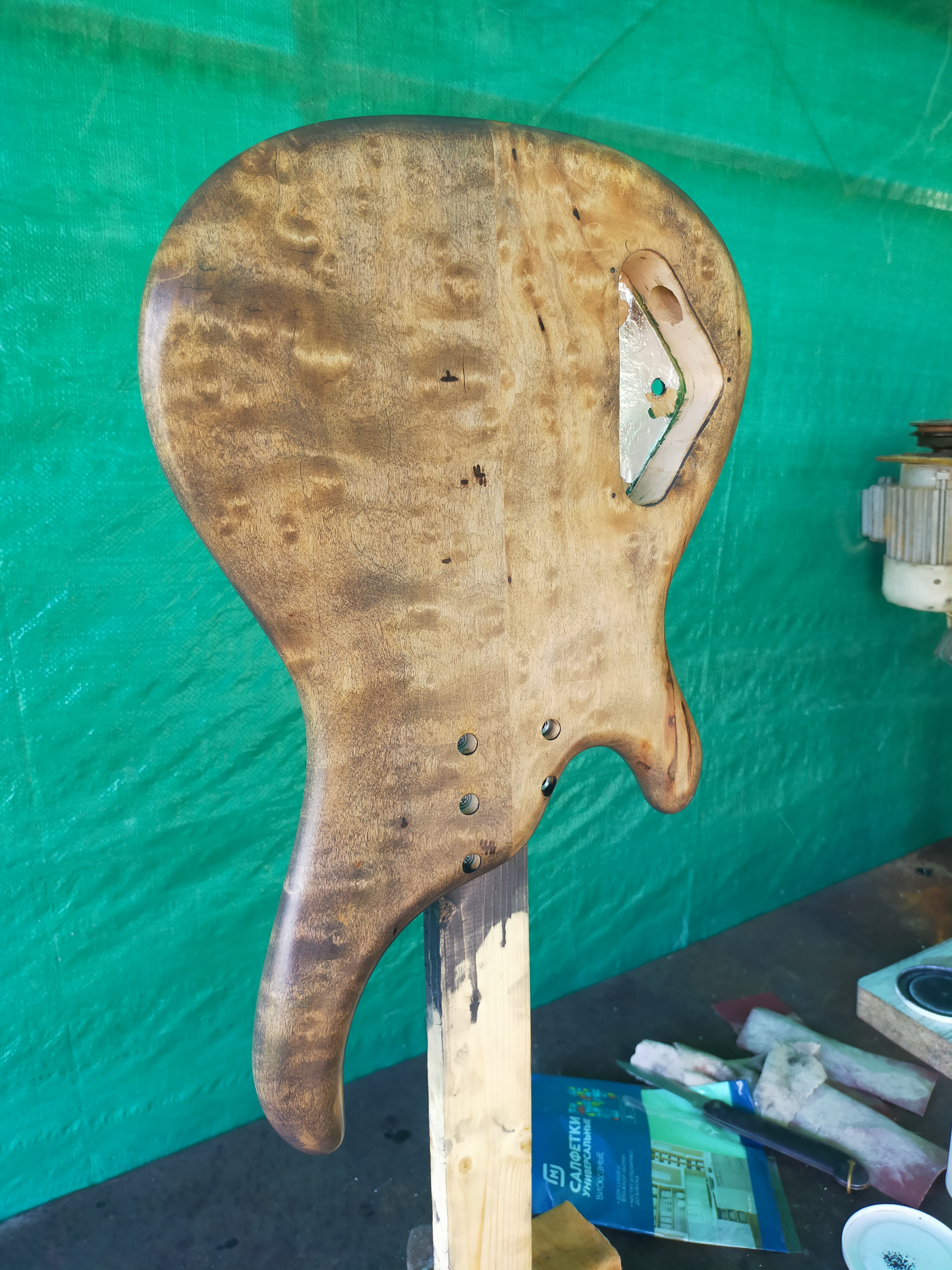 Опять перешкурил всё заново 240 грит, намешал масло с колером (гриф - венге/махагон), колер "графит" для деки пока едет. Подсмотрел у Уманского - оч понравился цвет. Будет конечно что-то другое, ну и хорошо.