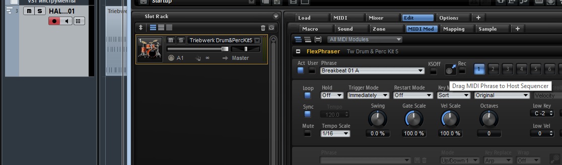 Добрый день! Просматриваю и пытаюсь разобраться в Triebwerk. Он интегрирован HALion5. Вроде многое уже раскопал, но не понятно одно. Там есть готовые для ударных грув-прессеты, как впрочем и для остальных звуков. Выбираешь прессет, нажимаешь на миди-клавиатуре, (в моем случае синтезатор) любую клавишу, звучит ритм. Пробуешь его записывать, прописывается естественно всего одна нажатая нота, что очень прискорбно для редактирования, а как перетащить этот миди файл в хост, не знаю, не получается. А если не получается, остается думать, что получаться то все должно по логике, только как это сделать, к своему сожалению не могу.