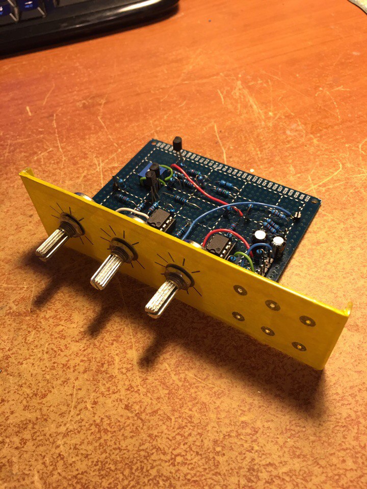 В общем модульная лихорадка не обошла и меня, но так как паять diy комплекты как-то скучно, я пошел по пути yusynth. Пока едут детальки для VCO собрал на коленке VCA модуль. Покрутив его и потыкав осциллографом изменил некоторые номиналы резисторов. Также сделал простенький MIDI-CV конвертер на ATMega328. VCA я собрал на макетке, травить было лень. ОУ у меня были только LM358. На выходе присутствует шум, буду менять на TL072, но в цепях cv они вполне себе будут работать. Панельку вырезал из пластика, потом сделаю сразу для всех из листового алюминия. Так что в полку прибыло :)