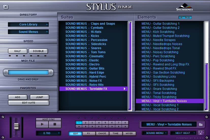 В Stylus который RMX это меню тоже присутствует (Core Library - Sound Menu - Turntable FX), но самих звуков там нет и поля из которого перетаскиваются звуки на дорожку пустое.