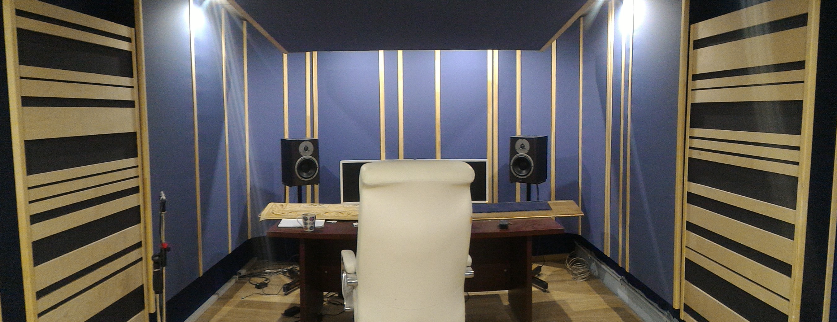 Непростая конструкция... фальшстены 35см-овые, много поглощения и диффузии. Исх помещение 6800х3150х2700. По факту - 5.300х3000х2300. За черной тканью 500мм поглощения, далее 35см звукоизоляция (развязка с улицей) воздух и окно на фундаментной стене