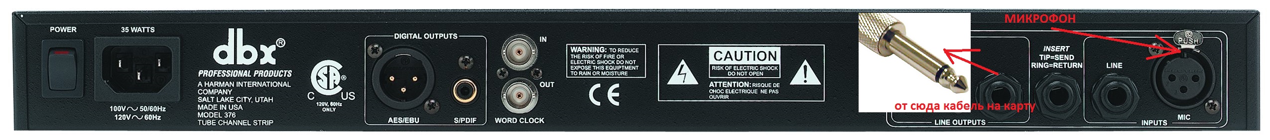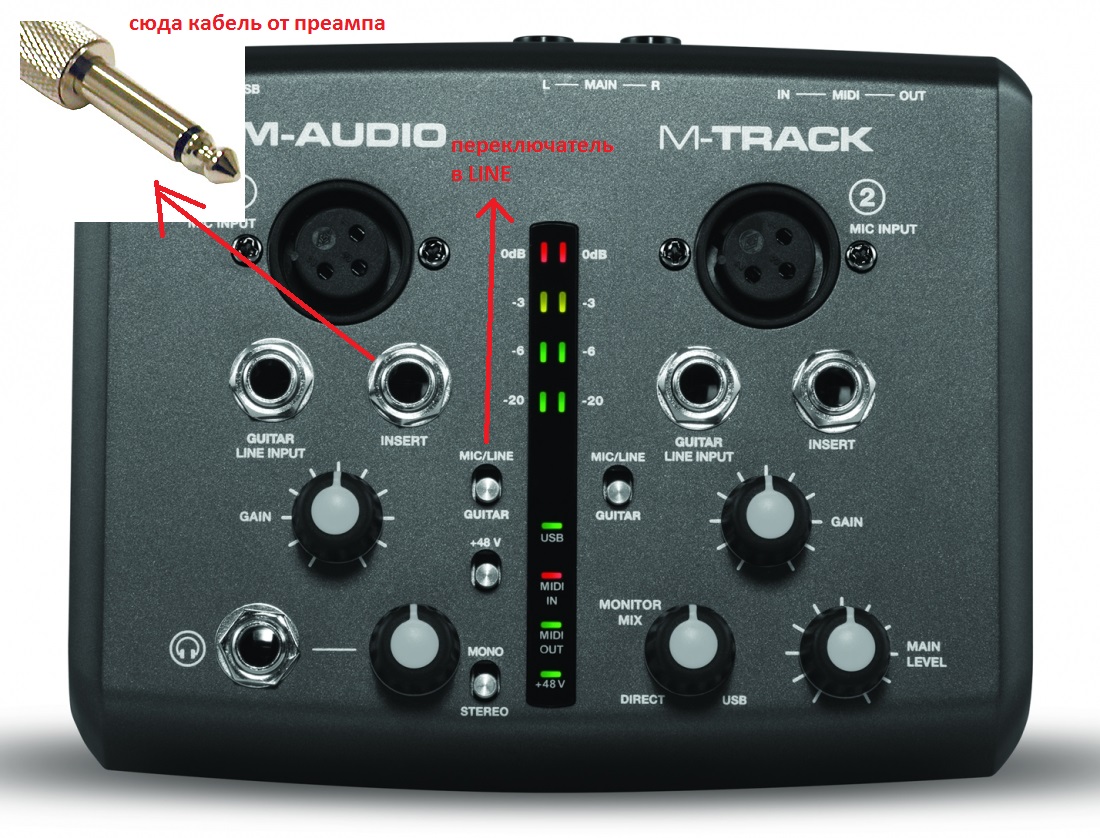 Такой кабель нужен, и подключение в входной разъём XLR на карте.