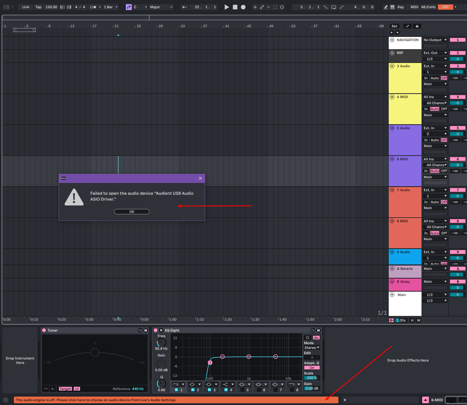 Комп всегда в режиме сна, Ableton всегда запущен, после того, как бужу ПК, Ableton выдаёт следующую ошибку "failed to open the audio device audient usb audio asio driver". Как будто драйвер слетает, приходится заходить в настройки аблетона и указывать драйвер карты самостоятельно. Как бы не критично, всё же работает по итогу. Но как будто так не должно быть.
