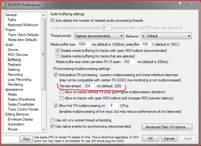 @Aleksandr Oleynik, RT CPU очень быстро растет, если много дорожек с включенным RecArm и мониторингом. У меня обычно максимум 2, остальные дороги живут в Anticipative processing и Render-Ahead, и RT CPU обычно 2-5%. Буфер обычно 64 семпла, очень редко поднимаю, и то, когда какой-нить жесткий плаг cо здоровенным буфером типа Denoiser используется в больших количествах.