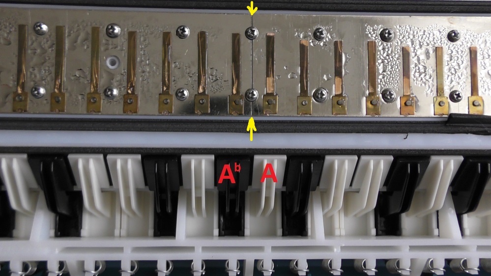 Как раз ля и ля бемоль не играют! А они находятся по обе стороны от той щели (я иё означил жёлтыми стрелочками).