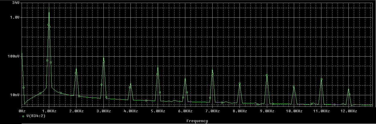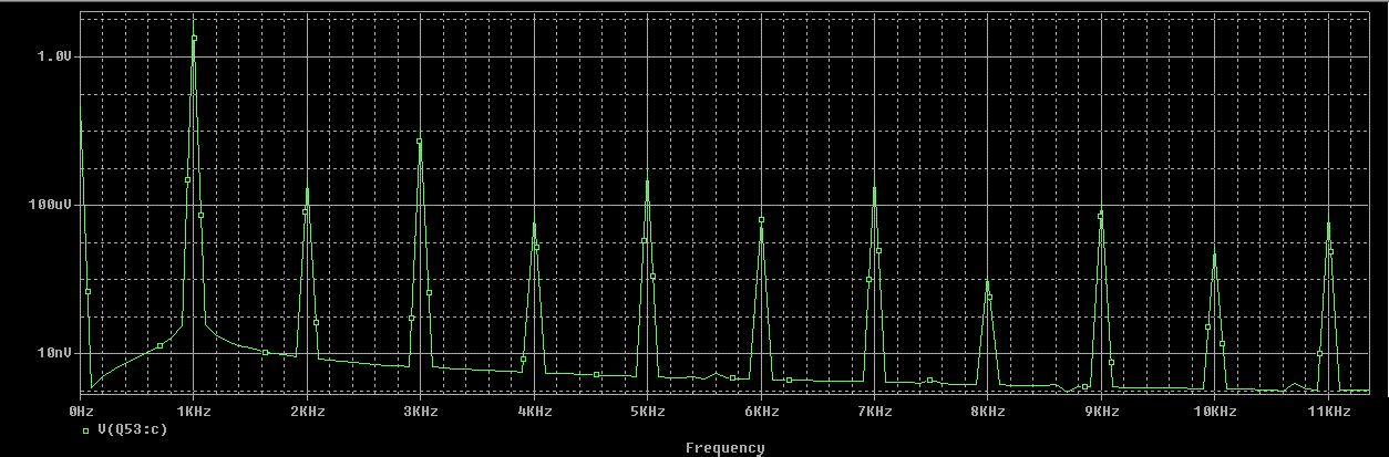Количественно это означает, что каждая следующая гармоника на 20...26 дБ меньше предыдущей (по крайней мере в области первых 5...7 гармоник), а экспоненциальный хвост дальних гармоник не превышает -150...160 дБ ни при каких условиях.