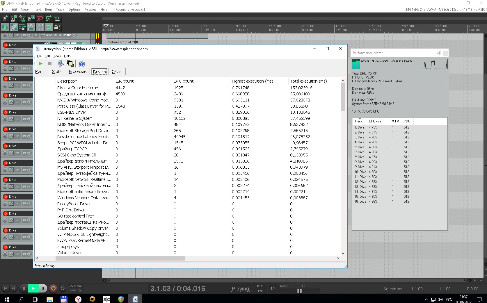 Еще не все! Поменял настройки в Рипере, скрин внизу. Потянуло 20 инстанций Дивы без тресков, на 21 пошли трески. Но при включении Rec Arm, трещит.