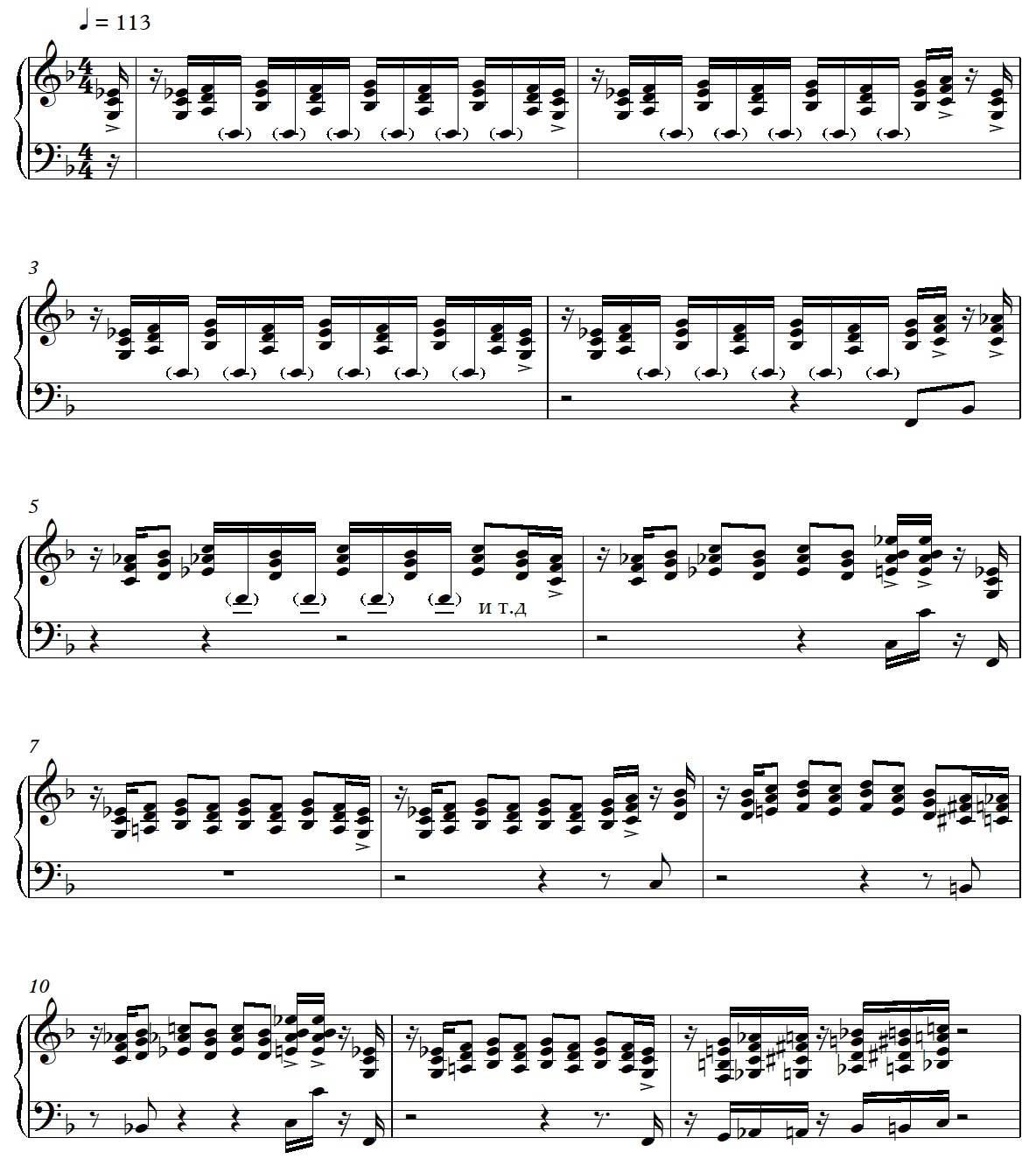 Партии пиано и баса. Между аккордами правой руки надо все время вставлять мелкие нотки в левой, я их не стал выписывать.