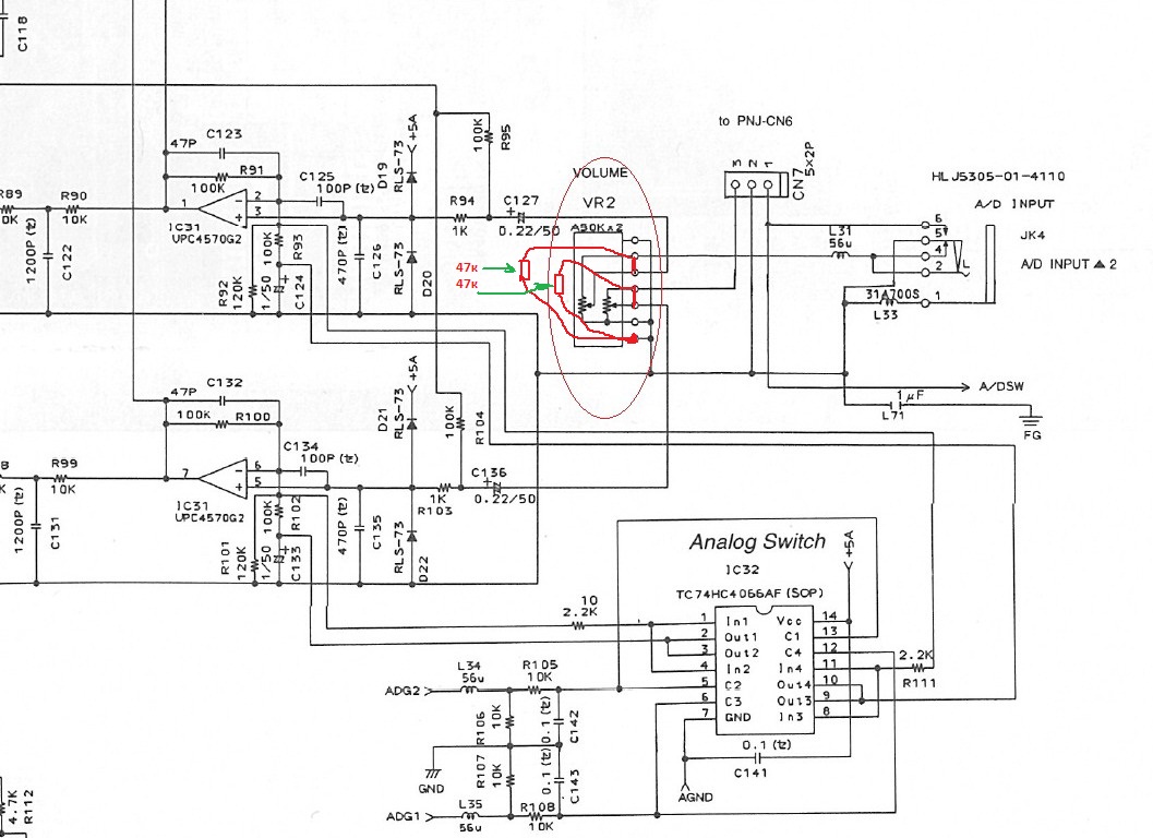 Господа. Хочу задействовать в качестве ревербератора аналоговый вход стареньких мозгов Ямаха МУ-80, но выломан сдвоенный потенциометр громкости 50 К редкого вида, на радиорынке не обнаружил. Соответственно хочу впаять постоянные сопротивления вместо, но не знаю куда. Кто может кинуть профессиональным взглядом и отрисовать на фотографии платы: куда мостить резисторы и куда перемычки, чтобы вxод просто был открыт по максимуму - обойдусь без регулировки.