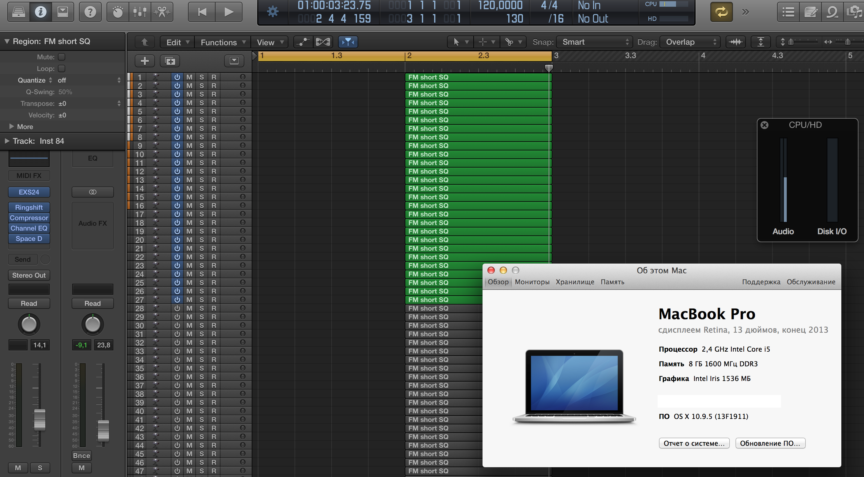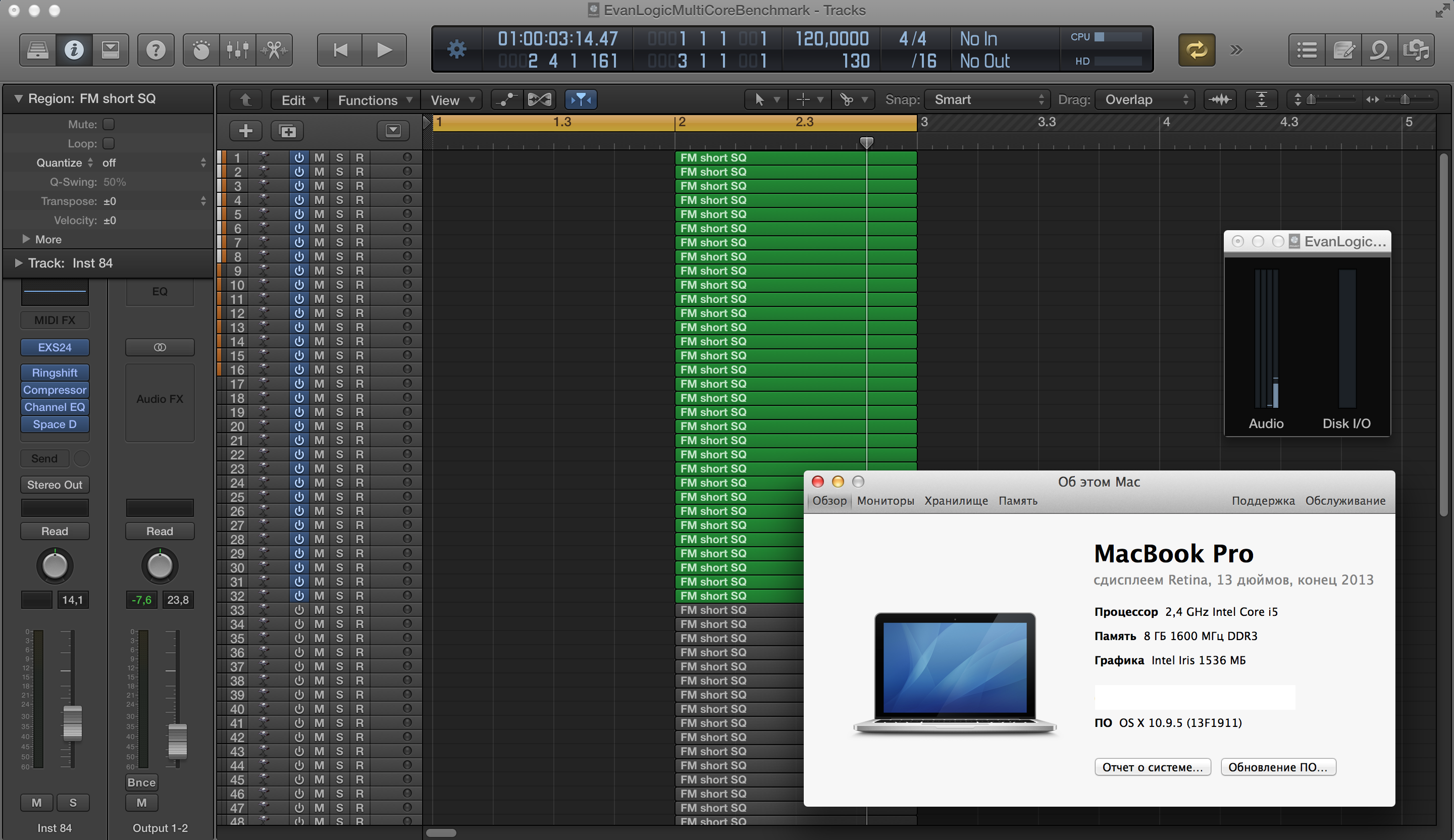 84 трека,все ядра под потолок. Макмини 2012 i7,16gb ram.буферсайз-1024 сэмпла.