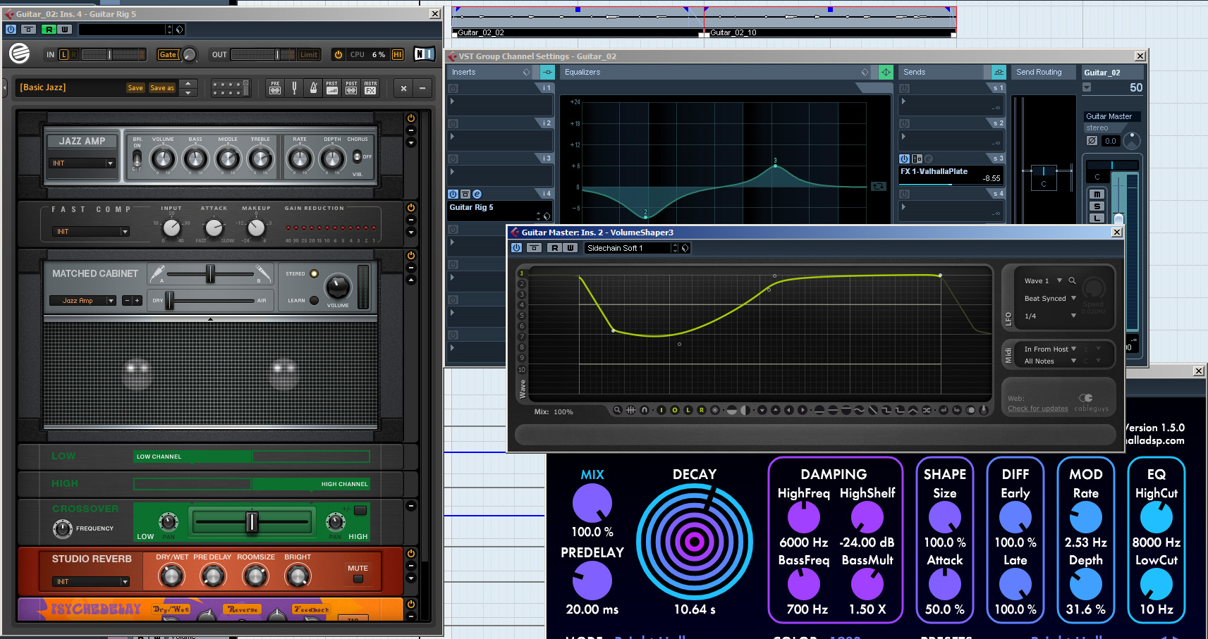 Накрутил приблизительно. Только там ещё у них вторая часть полуфразы зафильтрована каким-то low cut, но то уже не хватило моральных сил повторять) Короче, получается, гитара, бриджевый хамбакер, компрессор, эквалайзер, Валгалл Винтаж, Вольюм Шейпер. Всё вроде. А, ну, дилей из Гитар-рига.