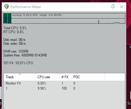 Да и что там можно увидеть, если у меня 10 ReaXComp - ов на треке потеребляют в сумме аж 0,6%? 40 штук - аж 2,6% - и всё это на одном ядре естественно - нафига компу подключать для такой мизерной нагрузки что-то ещё - В перформенс метре Общая нагрузка от 40 ReaXComp-ов на мой комп = 0,0 - 0,1% - при нажатой записи возрастает до 4 - 5 % и тогда Рипер подключает ещё одно ядро из 10-и.