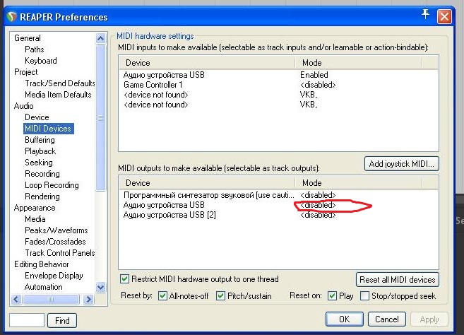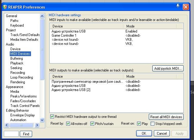 Добрый день! Прошу уважаемое сообщество помочь мне водном вопросе, если есть такая возможность. Я - новичок в создании музыки на компьютере. Есть у меня синтезатор Yamaha PSR-540, когда-то записывал музыку на нем, потом вообще забросил это дело и вот недавно решил возобновить. Решил для создания музыки использовать намного большие возможности компьютера, подключил Ямаху к компу с помощью простого кабеля midi - usb. В качестве программы для создания музыки решил использовать Рипер. Есть одна особенно актуальная проблема. У меня есть несколько незаконченных композиций, которые были записаны еще на синтезаторе. Я хотел продолжить записывать их уже с помощью Рипера, скопировал миди-файлы на комп, открыл в Рипере, причем открываются все дорожки, Рипер видит данные на каждом из треков, НО ЗВУКА НЕТ. В настройках программы Миди устройства вроде бы выбраны корректно (хотя могу и ошибаться, конечно). Как внешнюю клавиатуру Рипер видит синтезатор, VSTi инструменты с помощью клавиш синтезатора воспроизводятся и звучат на колонках компьютера, но никакие "личные" звуки и эффекты синтезатора не звучат. Может ли кто-нибудь подсказать что я делаю неправильно и возможно ли вообще как-то воспроизвести звуки синтезатора через рипер, и как "озвучить" записанные на синтезаторе миди-файлы в рипере? Спасибо.